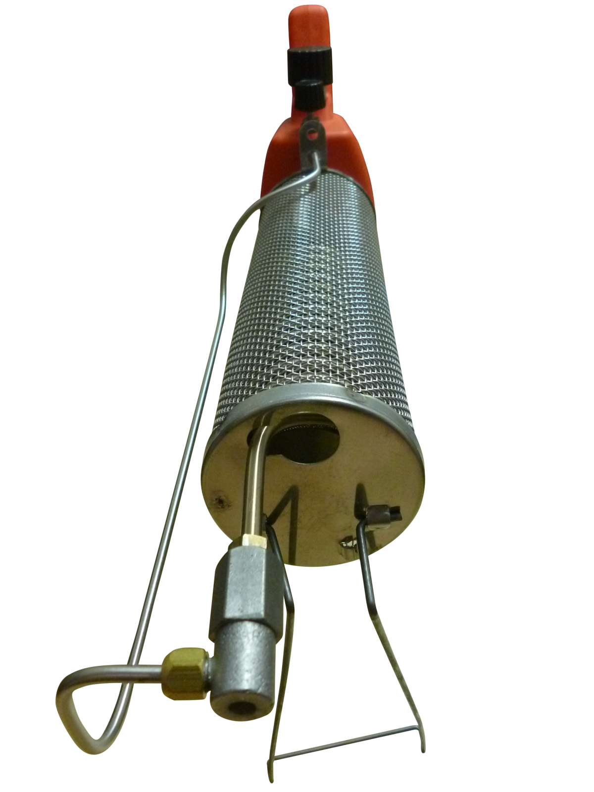 SM Bure BY100 Mini Foggers are supplied by a standard propane or cartridge of butane gas. The gas is lit by a piezoelectric element and gas heats a metal spiral tube. Water or diluted oil is then heated and mixed with the chemicals to create fog or steam.